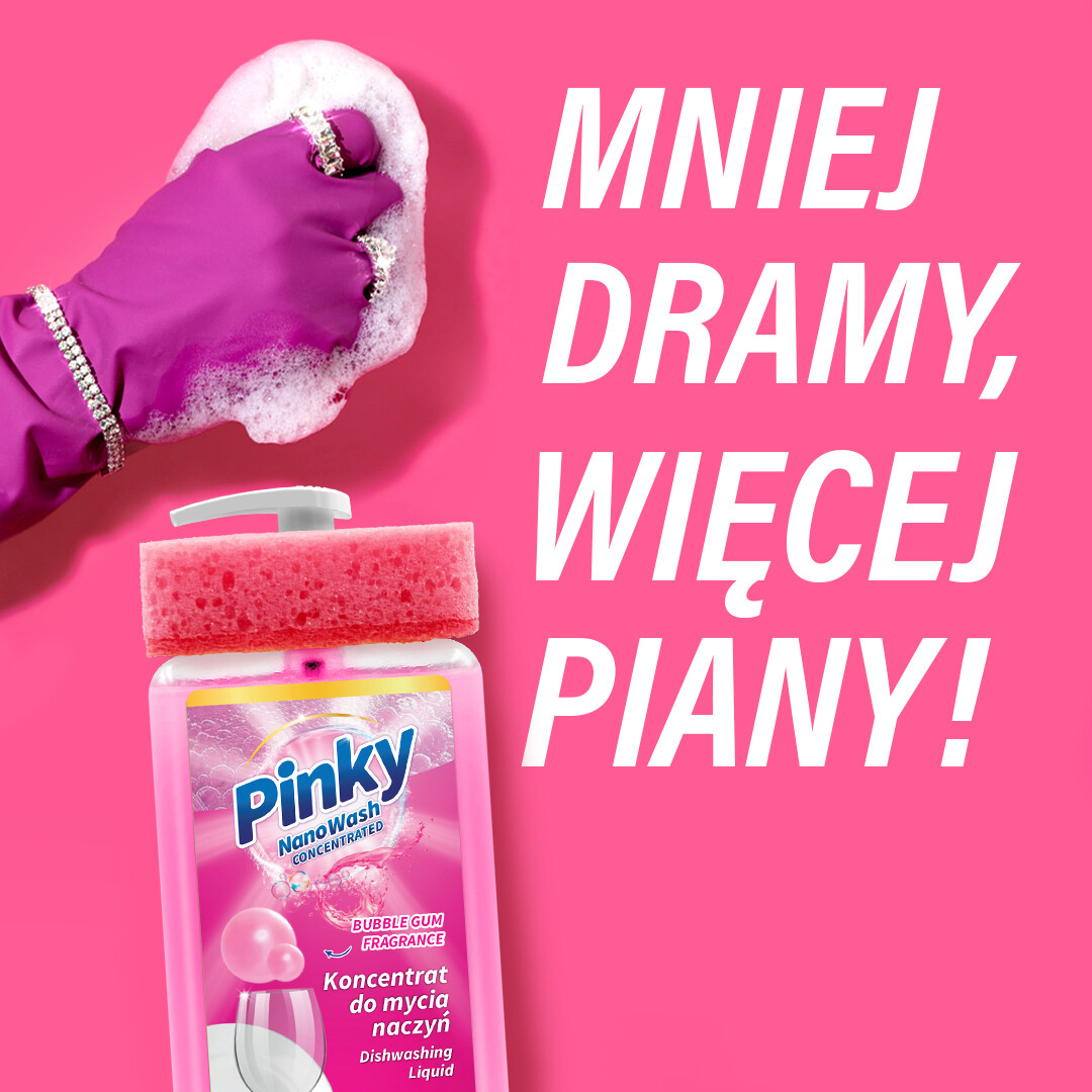 Płyn PINKY NanoWash nie tylko doskonale myje, ale także pozostawia naczynia świeże i błyszczące, bez smug i zacieków. Idealny do każdego rodzaju naczyń – od szkła, po patelnie..